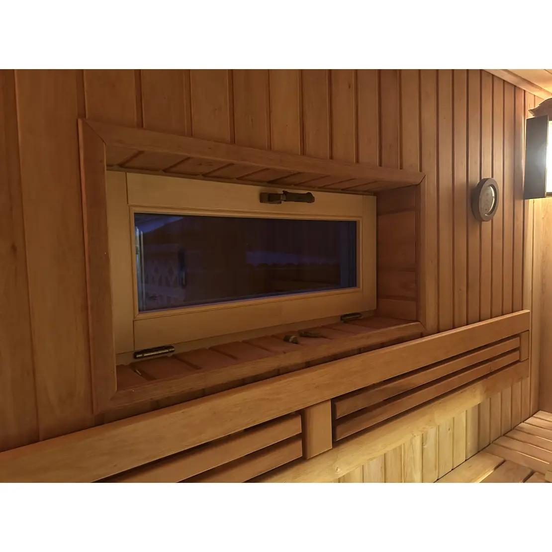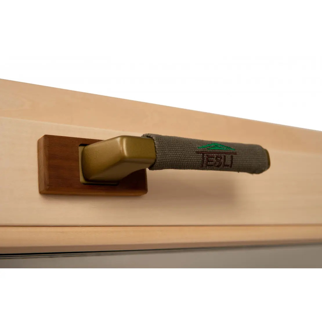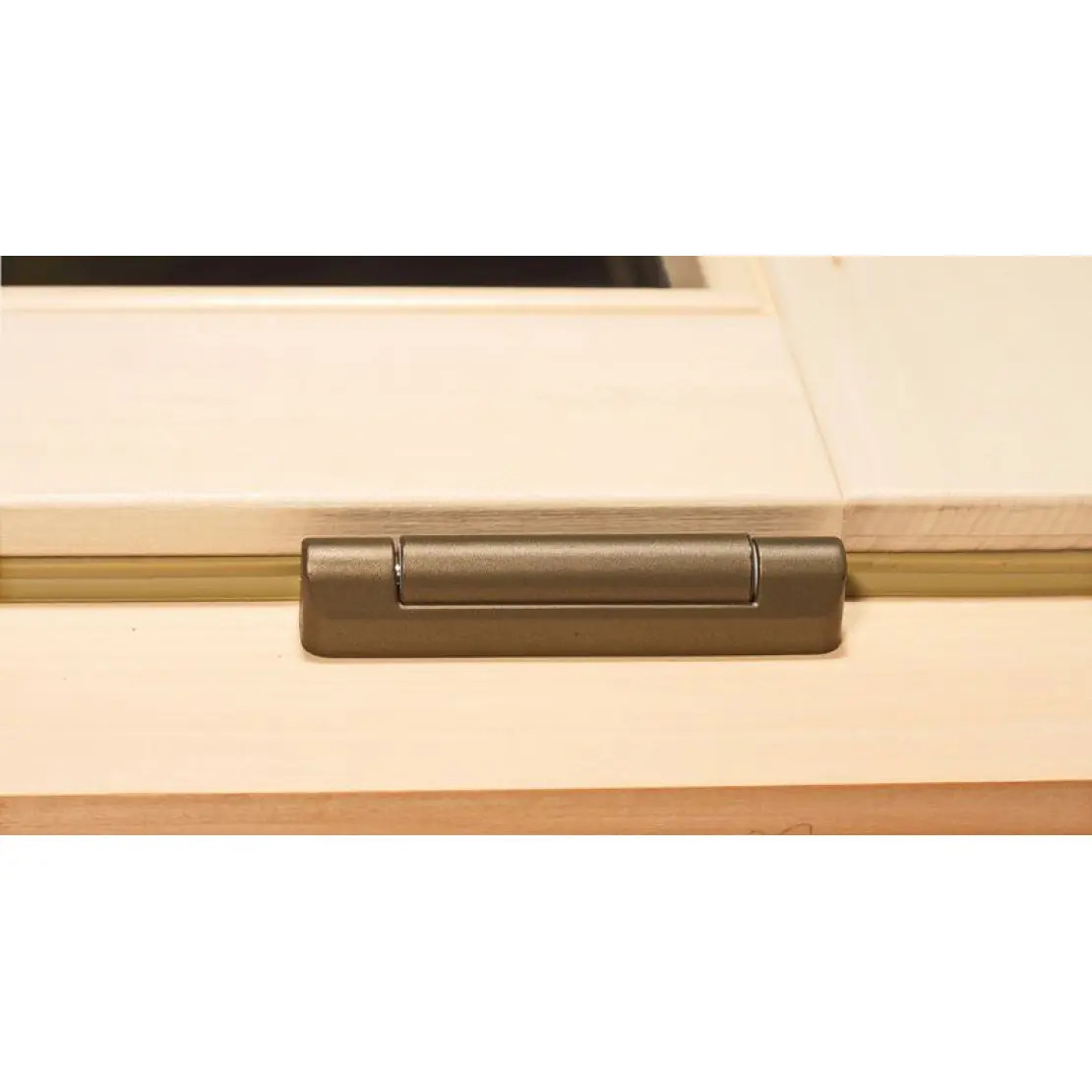 Der Fenstergriff ist mit einer speziellen Schutzschicht versehen, die Überhitzung verhindert und eine sichere Bedienung auch bei langen Saunagängen ermöglicht.